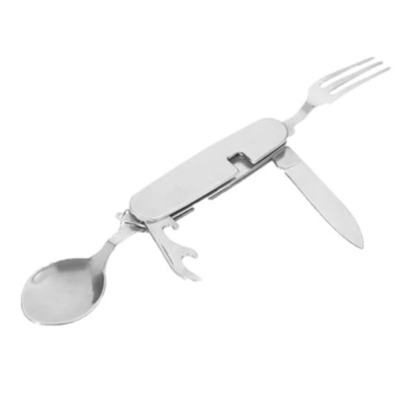 Практичний набір «Ніж складаний з вилкою та ложкою», що включає столові прилади - ніж, вилку, ложку та відкривалку для банок та пляшок з нержавіючої сталі.